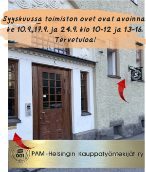 10.9. alkaen toimiston ovet pidetään avoinna keskiviikkoisin klo 10-12 ja 13-16 joitakin poikkeuksia lukuun ottamatta.